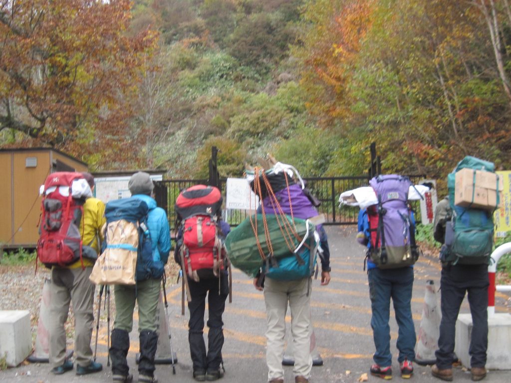 10月25日(土)とてもきれいな鞍掛山の紅葉を横目に、奥産道から三ツ石山に向かいました。三ツ石山は紅葉が終わっているので、人気はないはずと思っていましたが、駐車場には10台以上の車がありました。網張スキー場から奥産道登山口辺りまでは紅葉がきれいで、薪を入れた15~30kgのザックを背負い、ゆっくり紅葉を見ながら歩きました。三ツ石山荘には10人ほどが休憩していましたが、私たちが到着すると、山頂を目指して出発しました。山頂はガスで見えなかったので、私たちは背負ってきた薪を格納して、早めの昼食を取って下山しました。これで、雪山の準備は万端です!!