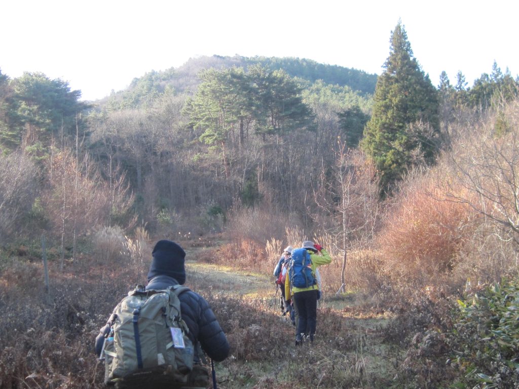 11月30日(日)宮守から砥森山に行ってきました。宮守の道の駅で休憩して間もなく林道に入り、舗装道路の終点まで行くと、ちょうど車3台駐車できるスペースがありました。そこから登山道になっていて、見上げると砥森山がありました。登山道に入るとまもなく、豆柿の木があり、直径5cmほどの豆柿の実をつけていました。周囲に熊がいないことを確認して、みんなで豆柿を取って食べました。とても甘くて、これは熊の好物になるなと思いました。その後、登山道には熊やカモシカの糞が散在し、野生動物のフィールドに入ったことを実感しました。砥森山山頂からは眼下に田瀬湖、遠くに夏油高原スキー場の白い筋が見えました。