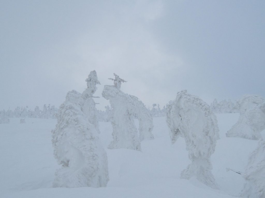 2月14日(土)八幡平の樹氷の様子を見に、秋田八幡平スキー場から山に入りました。出発がやや遅れたため、しっかりとした舗装道路並みのトレースができていました。朝方は青空だったのですが、次第に曇ってきて、標高1604mの藤助森のあたりではホワイトアウトとなりました。しかし、思ったより風が弱いため、トレースが消されずについていたためそれを辿って山頂に着きました。先行したワカン隊4人と出会い、風をよけて展望台の下で昼食を取りました。視界は効かず、上を見ても下を見てもグレーの世界の真っただ中にいる状態でした。1300mぐらいまで下ってくると、青空が顔を出し、成長途上の樹氷も見られるようになしました。